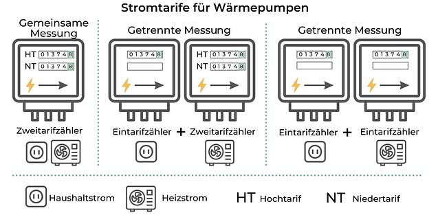 Auf dem Markt sind zwei verschiedene Arten von Wärmepumpentarife erhältlich: Eintarifzähler rechnet den kompletten Stromverbrauch der Wärmepumpe zum gleichen Preis ab und Doppeltarifzähler rechnen den Stromverbrauch der Wärmepumpe je nach Tageszeit oder Netzauslastung ab.