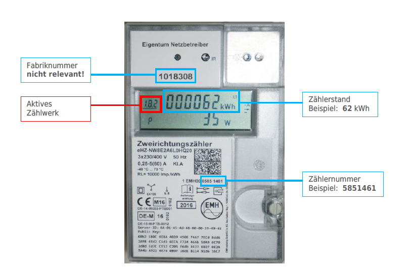 Bei einem Eintarifzähler ist nur die Anzeige 2 relevant. Hier wird der Gesamtverbrauch gemessen. Bei einem Doppeltarifzähler wird auf der Anzeige 1 der Tarif 1 (HT) und auf der Anzeige 2 der Tarif 2 (NT) gemessen.